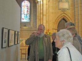 Immediately after Maurice’s talk we all trotted over to the cathedral where Brian Partridge’s ‘Alice’ art was on display (left) and we were given a lovely talk by Brian, who was in attendance. Brian told us about how the art work came about and mentioned that he had moved onto several other things after drawing ‘Alice’ but each time it came back to haunt him! He explained how he drew the black and white pictures on display and said that some were produced in minutes whereas others could be months in the making. Back in the Old Deanery we had tea of sandwiches and cakes before those who wished went to evensong and others chatted in the Old Deanery dining room.