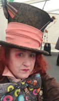 The theatrical costumiere Lilian Chapman sent us the pictures you see of a Mad Hatter outfit she made In her words:- “I’m a costume designer and maker, working for the last 30 years in Film Theatre & TV Here’s a few photos of my Mad Hatter costume, I made a version of Johnny Depps’ costume for Comiccon, (an event where people dress as their favourite character from film, tv and comics) I’ve tried to make everything myself and used up-cycling, using clothes from charity shops and scraps from my fabric collection, I’ve enjoyed working on this as I love doing research and millinery is a favourite of mine. By the way ,the large bow was hand painted as I couldn’t find a decent “All sorts” fabric. I wore this on April 27th at the NorthWales Comiccon at Glyndwr University in Wrexham".