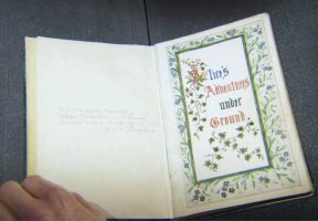 At this point Carroll was unknown whilst Tenniel was the well known premier illustrator for Punch. He was also a perfectionist with great attention to detail. The 2000 copies produced for the 1865 publication were scrapped on Tenniel’s instructions as he was dissatisfied with them. The images were faint and there was a faint bleed of print through pages. Here again we see Edward Wakeling in the British Library this time with the one fragile copy of this scrapped edition in the Library’s possession.