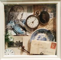 Well the long awaited exhibition, ‘Inspired by Alice’, at the Atkinson gallery in Southport has been and gone. It was curated by Joanne Chamberlain We hope you managed to see it. The panorama above gives an idea of how it looked. You entered through a pair of closed curtains rather like Alice’s entrance to the garden.