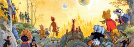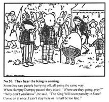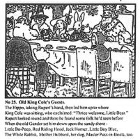 The Wonderland characters that briefly appear are the White Rabbit, fish footman, and Humpty Dumpty. There is a tea party with Old King Cole and other nursey rhyme characters, the plum pudding and jelly start to fight and cause the table to be up-turned. In picture 49 a dog photographer under the sheet with camera on a tripod takes Rupert and Bill's picture. At the end the gander takes him back but crash lands waking Rupert up who has fallen out of his chair.