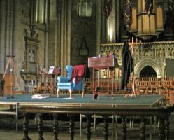 After the performance the mayor of Ripon, Councillor Andrew Williams, gave a short thank you speech to the actor, his technical man and to the arrangers of the event. The evening concluded with the Ripon horn blower coming down the cathedral aisle to blow the horn for the curfew and have this acknowledged by the Mayor.