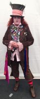 The theatrical costumiere Lilian Chapman sent us the pictures you see of a Mad Hatter outfit she made In her words:- “I’m a costume designer and maker, working for the last 30 years in Film Theatre & TV Here’s a few photos of my Mad Hatter costume, I made a version of Johnny Depps’ costume for Comiccon, (an event where people dress as their favourite character from film, tv and comics) I’ve tried to make everything myself and used up-cycling, using clothes from charity shops and scraps from my fabric collection, I’ve enjoyed working on this as I love doing research and millinery is a favourite of mine. By the way ,the large bow was hand painted as I couldn’t find a decent “All sorts” fabric. I wore this on April 27th at the NorthWales Comiccon at Glyndwr University in Wrexham".