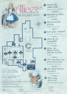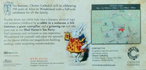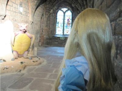 Chester Cathedral celebrated the 150th Anniversary with an exhibition featuring various scenes from Alice in Wonderland staged within the cathedral building.