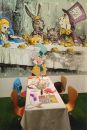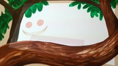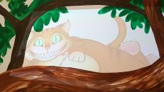 Once Inside we first noticed the illustrations on the wall of the Cheshire cat in a tree. With the cat continually appearing and disappearing. In this vein, for the young at heart, there was a table set in the spirit of the Mad Hatter’s Tea Party complete with dress-up costumes and murals depicting the participants.