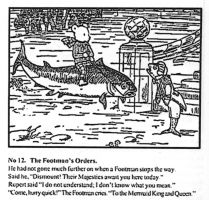 The Wonderland characters that briefly appear are the White Rabbit, fish footman, and Humpty Dumpty. There is a tea party with Old King Cole and other nursey rhyme characters, the plum pudding and jelly start to fight and cause the table to be up-turned. In picture 49 a dog photographer under the sheet with camera on a tripod takes Rupert and Bill's picture. At the end the gander takes him back but crash lands waking Rupert up who has fallen out of his chair.